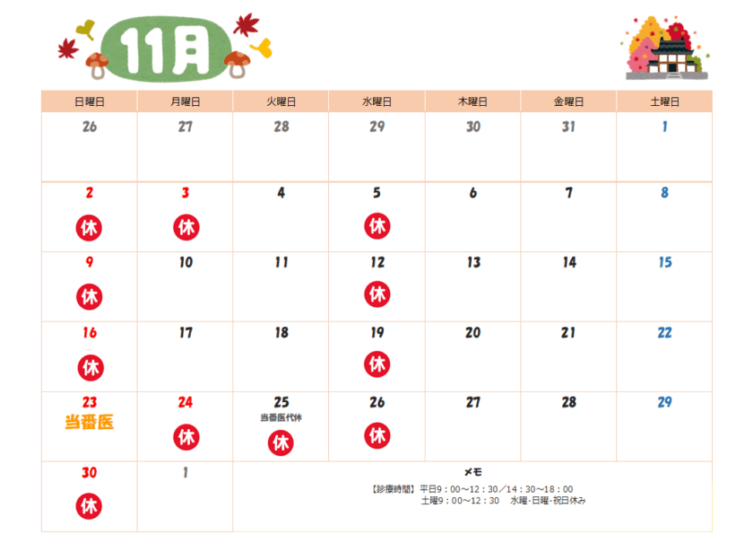 11月の診療カレンダー 投稿日:2025.10.31 11月の診療カレンダーです。 事情により、急遽予定が変更になることがあります。 あらかじめご了承ください。 当日の診察予約は、朝8時より直接ご来院予約、 朝8時30分より電話での予約をお受け致します。