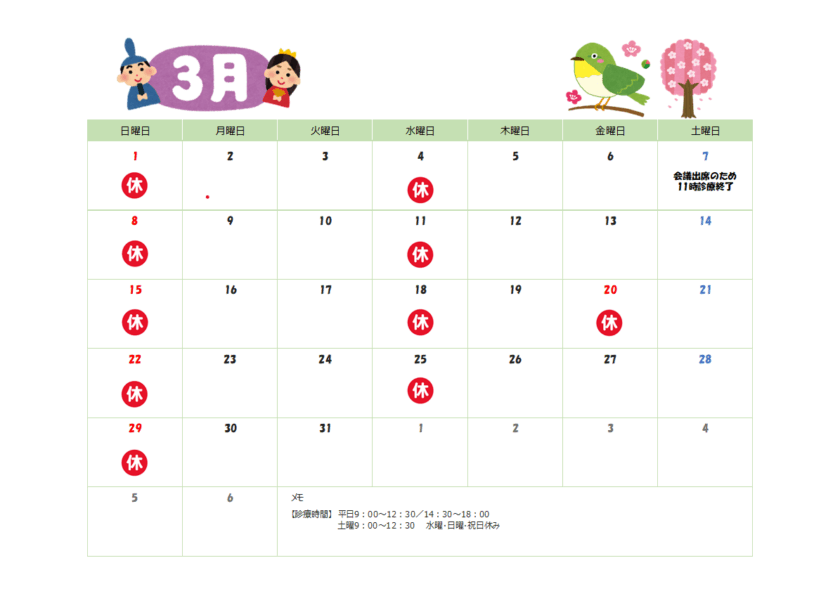 3月7日(土)は院長の会議出席に伴い、11時迄の診療となります。