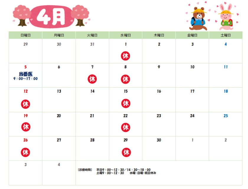 4月の診療カレンダー 投稿日:2026.04.01 4月の診療カレンダーです 4月5日(日)は当番医となるため、 4月7日(火)は代休とさせていただきます。 ご不便をおかけしますが、何卒よろしくお願い致します。